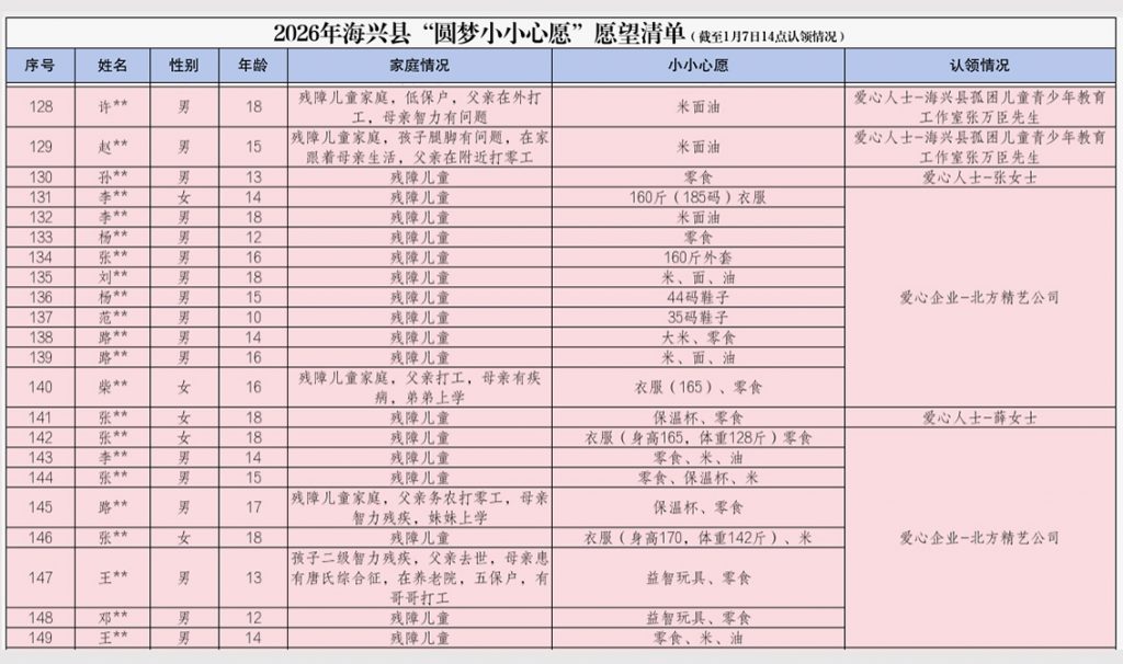 每一个心愿背后,都藏着孩子对美好世界的向往。或许是一份渴望已久的学习用品,或许是一套崭新的衣鞋,也或许是保障生活的米面油……这些看似朴素的小小心愿,却是孩子们心中最真切的期盼,承载着他们对美好生活的憧憬与向往。活动前期,海兴县团委悉心征集孩子们的心愿清单,北方精艺第一时间响应,精心筹备每份礼物,力求让每一份期待都能如约而至,让每一颗童心都能被温柔呵护。